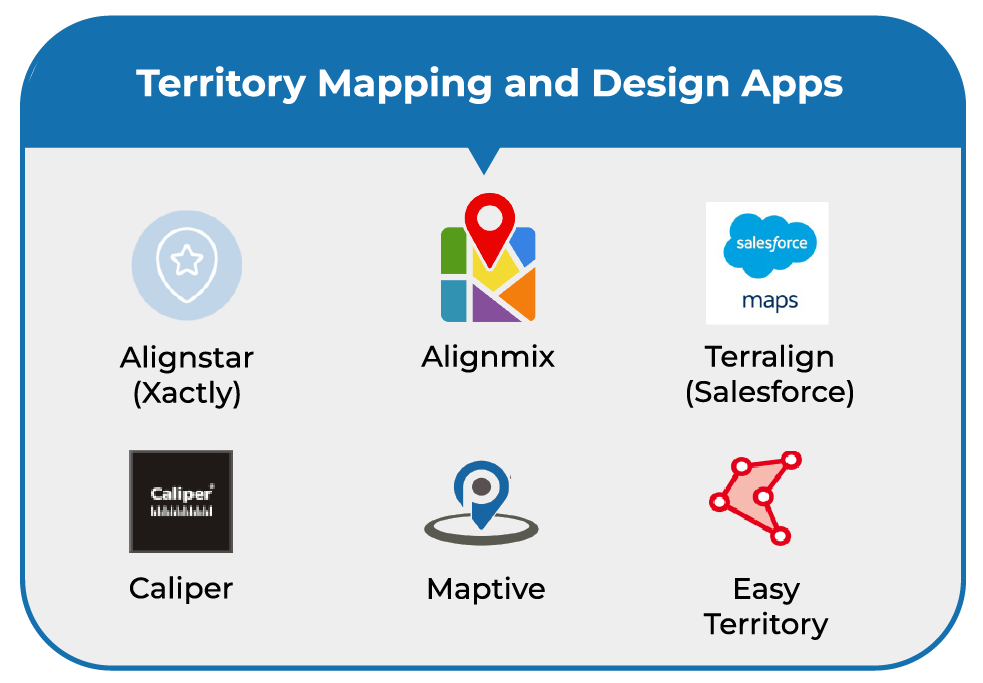 Territory Mapping and Design Apps | - AlignStar from Xactly, - AlignMix, - Terralign from Salesforce Maps, - Caliper Maptitude, - Maptive, - EasyTerritory | Designs, balances, and creates sales territories. | Sales Operations or Sales Management | Beverages, Healthcare, Pharmaceuticals, Chemicals, CPG, Manufacturing, Tires, Software, Hardware | “The SalesOps team built out the territories, figured out the compensation plan, and assigned the accounts to the Sales Team using a Territory Mapping App.” |
